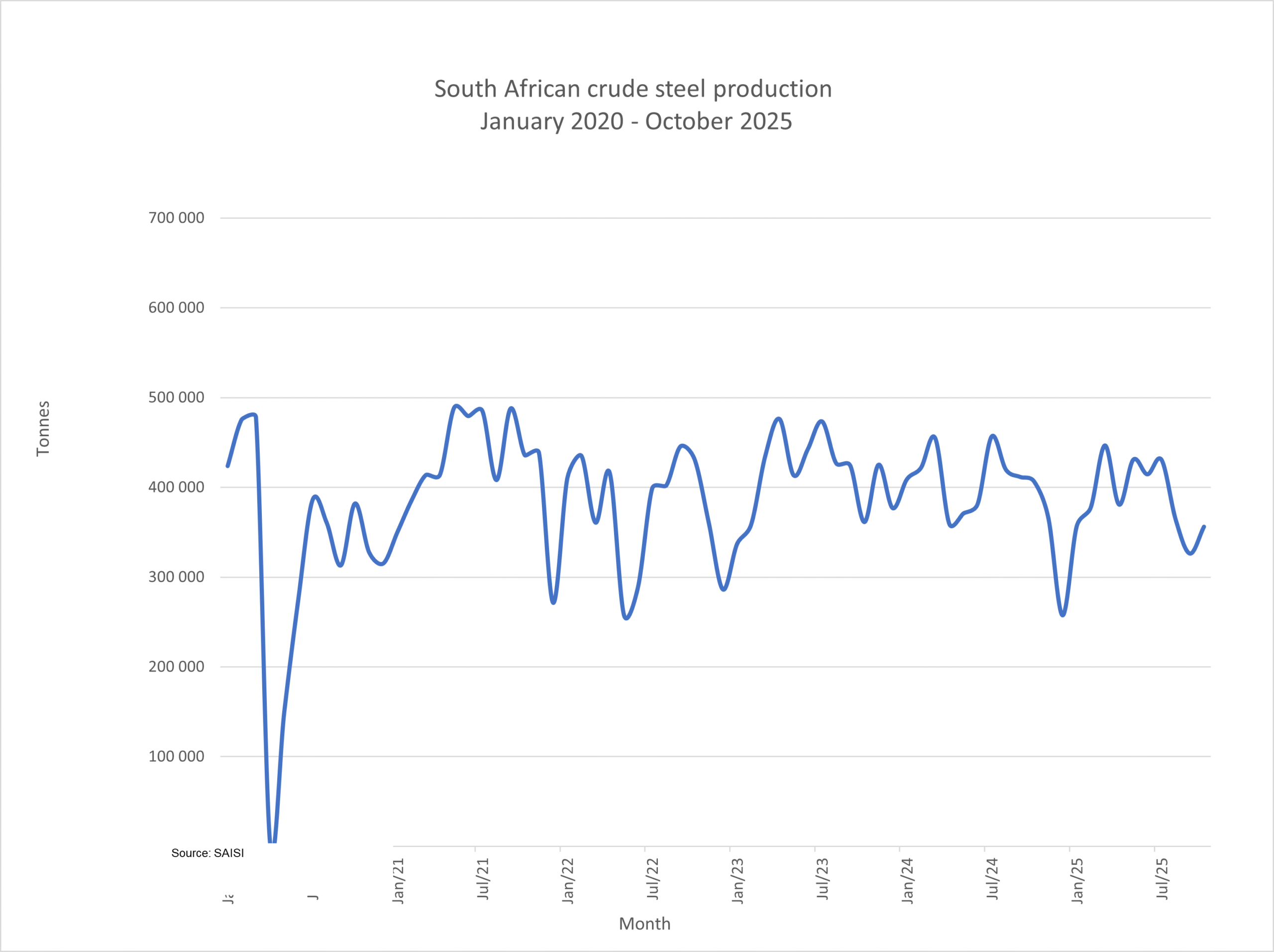 South Africa’s crude steel production fell to 356,300 tonnes in October 2025, a 12.4% decrease compared to the same month in 2024. For the period January–October 2025, cumulative output reached 3.89 million tonnes, representing a 4.9% year-on-year decline.