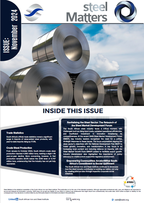 The November 2024 issue of Steel Matters highlights the South African steel industry's challenges, collaborative strategies, trade statistics, and impactful community upliftment initiatives.