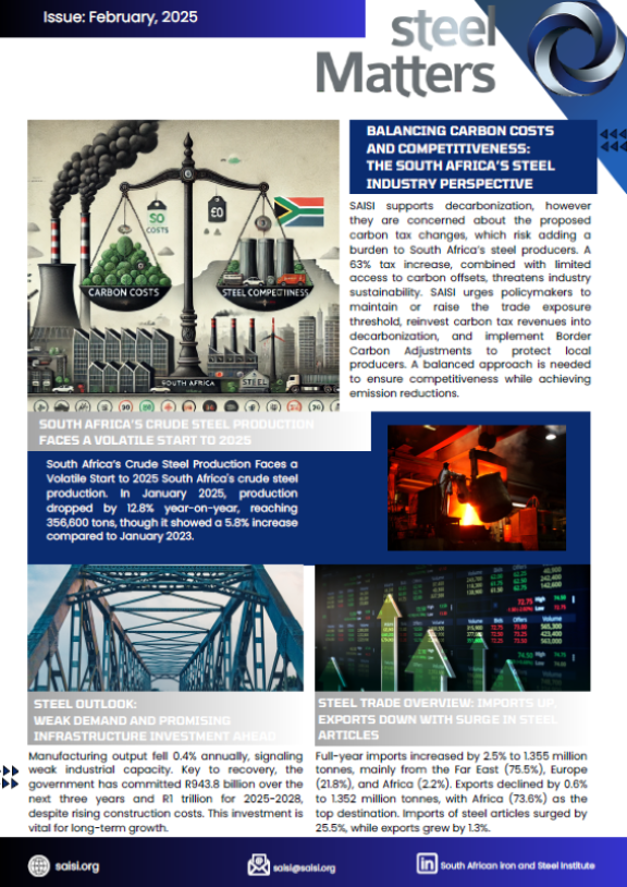 The February 2025 SteelMatters highlights South Africa’s steel industry’s volatile start, crude steel production drop, import surges, carbon tax concerns, and SAISI’s policy recommendations for competitiveness and sustainability