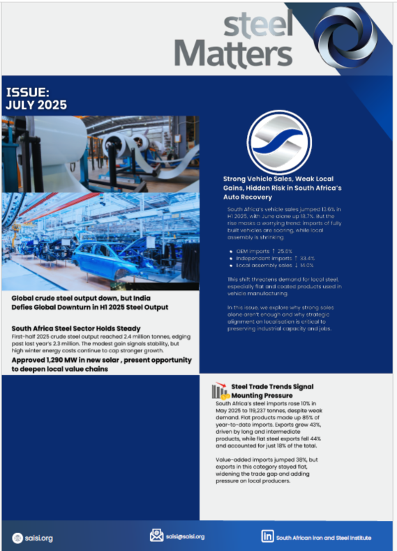 The August 2025 SteelMatters highlights global shifts in steel production, SA’s export growth, CBAM challenges, record car sales, and circular economy innovations driving resilience and sustainability.
