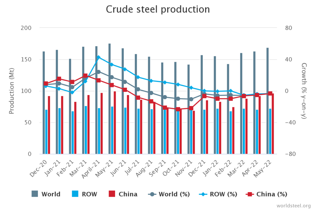 World crude steel production for the 64 countries reporting to the World Steel Association (worldsteel) was 169.5 million tonnes (Mt) in May 2022, a 3.5% decrease compared to May 2021.
